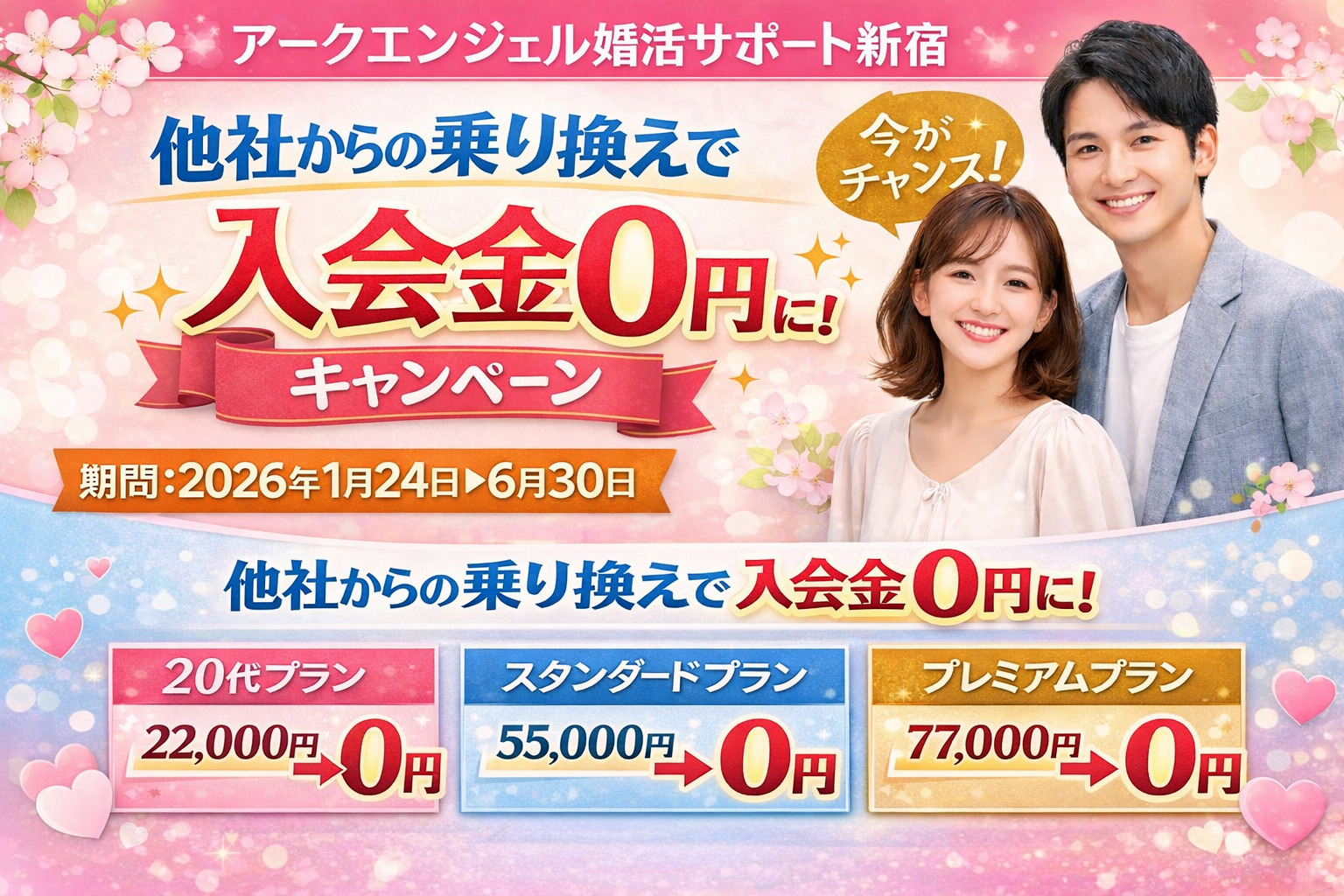 他社結婚相談所からの乗り換えで「入会金が0円」になるキャンペーンを実施いたします。